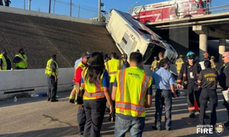 Houston METRO bus teeters on the edge of an embankment after a terrifying plunge from an elevated highway near Midtown. With...