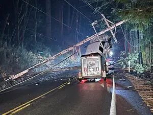 A car in Mason County crashes into a power pole, leaving it suspended by power lines on US 101. The road...