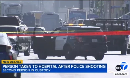 In a tense standoff in DTLA, a suspect in a reportedly stolen car is shot by police after reaching for what...